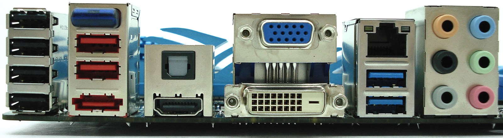 A destacar los 2 conectores USB 3.0 y la conservación del conector eSATA. Además, disponemos de múltiples conectores gráficos, con lo que podremos prescindir de una tarjeta gráfica dedicada, aprovechando la arquitectura Sandy Bridge, junto con la iGPU de los procesadores Intel compatibles. Tal como hemos señalado anteriormente, dispone de un novedoso módulo Bluetooth que mejora esta otra tecnología inalámbrica de comunicación de datos, que junto con el puerto de red RJ45 harán el resto para tener la placa base bien comunicada con el exterior.