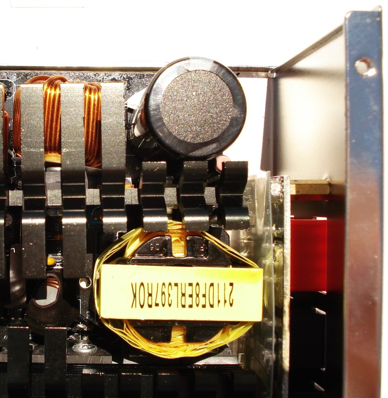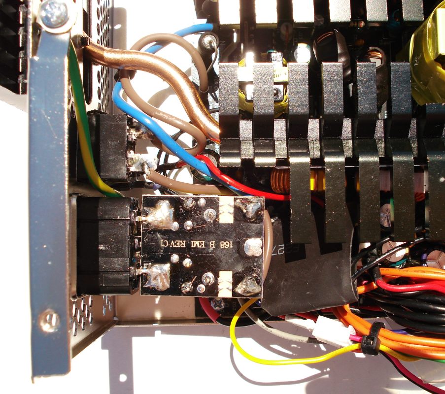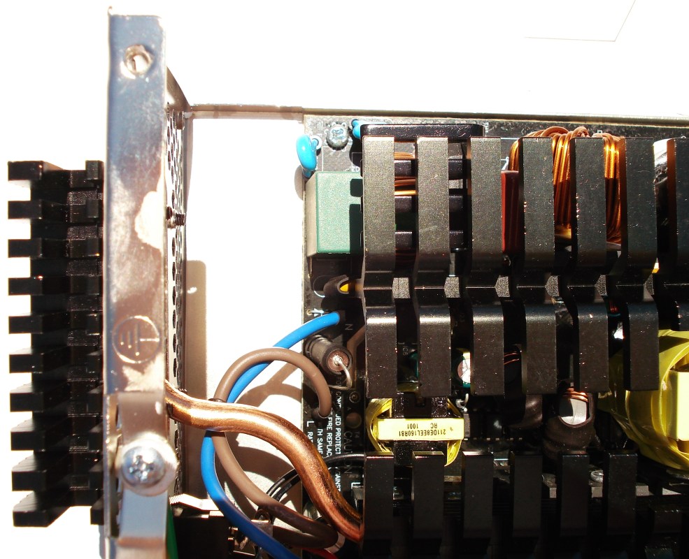 Podemos apreciar el paso de la disipación del interior de la fuente al exterior, a través del heatpipe de cobre. Los cables azul y marrón, están algo expuestos a este tubo de cobre. Por estos cables también circula una elevada tensión, que se adivina por el grosor de los mismos.