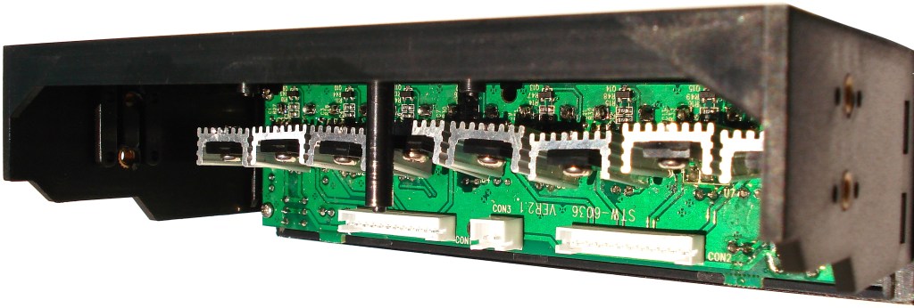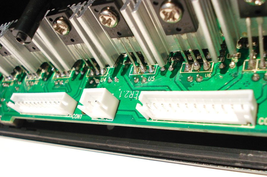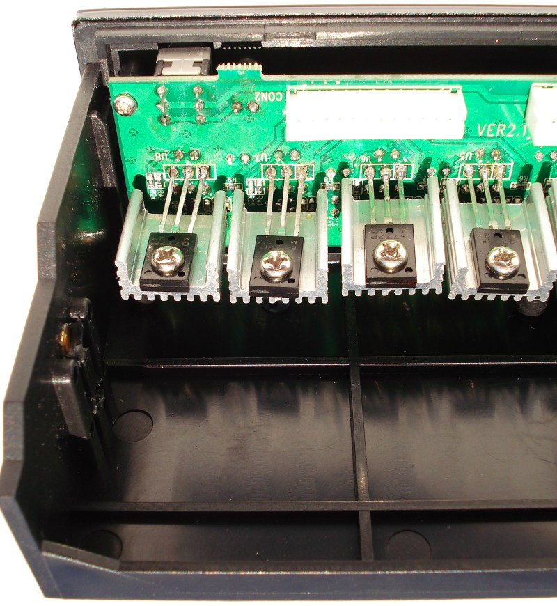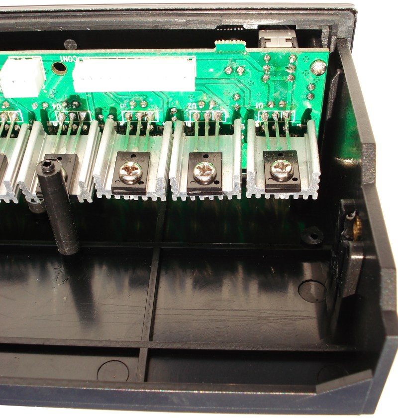 La electrónica posee de un transistor por cada canal. En total 8 transistores medianos, cada uno de ellos en contacto con un pequeño disipador de aluminio, para disiparlo independientemente.