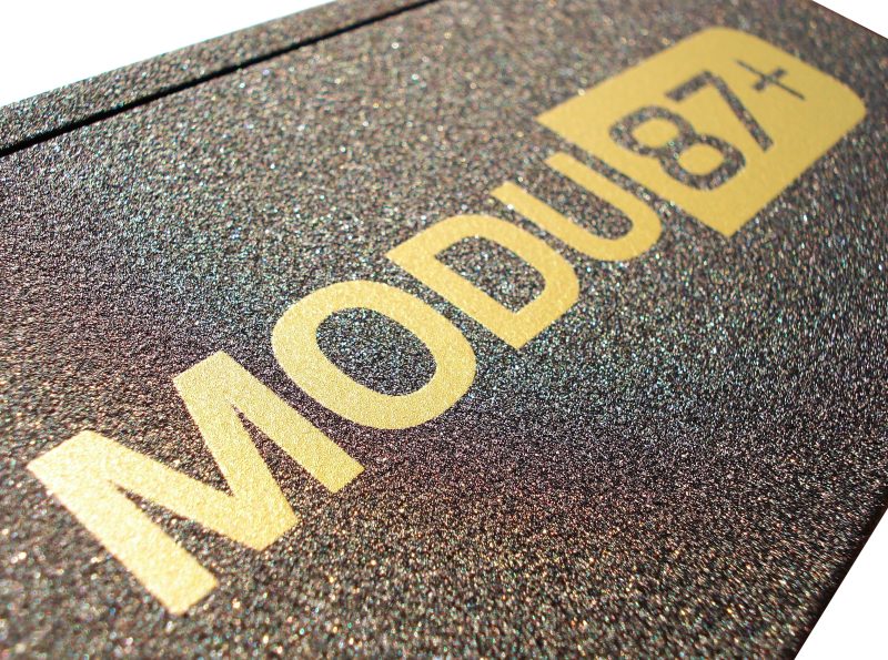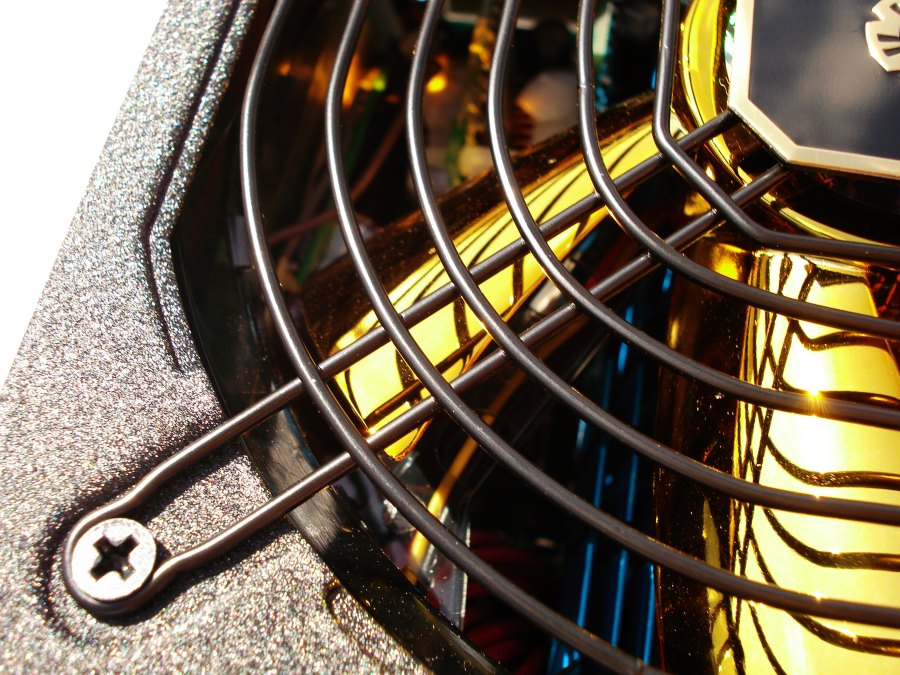 A veces una imagen vale más que 100o palabras. E aquí el motivo MODU87+ pintado en dorado sobre el extraordinario acabado granulado, que le da una textura rugosa, áspera y sobria por sus colores oscuros (textura usada en todo el exterior de la fuente). Hemos visto infinidad de acabados de diferentes tipos, negros o grises mate o brillo, blancos u otro colores más vivos… Acabados imitando a las fibras de carbono, cepillados, o éste, que sinceramente se sale. Los granos son grises claros y oscuros, con otros brillantes; parece que imite a la superficie de un mineral de pequeño grano, sin pulimentar. En realidad la fotografía, a pesar de estar concienzudamente tomada, no hace justicia al excelente acabado exterior que ENERMAX a dotado a esta fuente. Estamos convencidos que se empleará en otros modelos aún por salir por parte del fabricante, y no es para menos.
