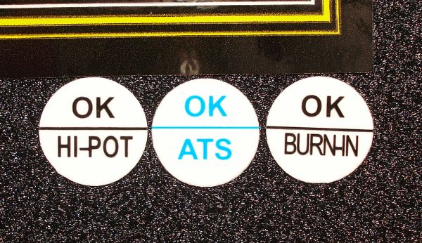 Estas pegatinas indican el aprobado en tres de los controles que se han llevado a cabo en esta pieza en concreto para «darla de alta»; el de arranque, alta potencia y el de ATS. También es común encontrar este tipo de pegatinas en el interior de la fuente de alimentación.