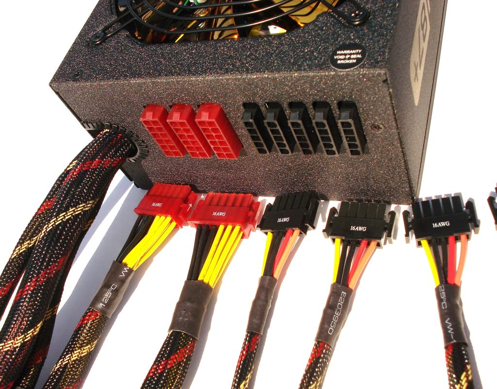 Como podemos ver, el surtido de cables no concuerda con el nº de conectores del panel; sobra un conector de color rojo. El motivo suele ser que este diseño de panel es empleado por el fabricante en fuentes de mayor potencia. Por tanto, éstas vienen con más cables modulares, pudiéndose emplear todos los conectores a la vez. De todas formas, los 3 conectores rojos son plenamente funcionales con este modelo de 800W.