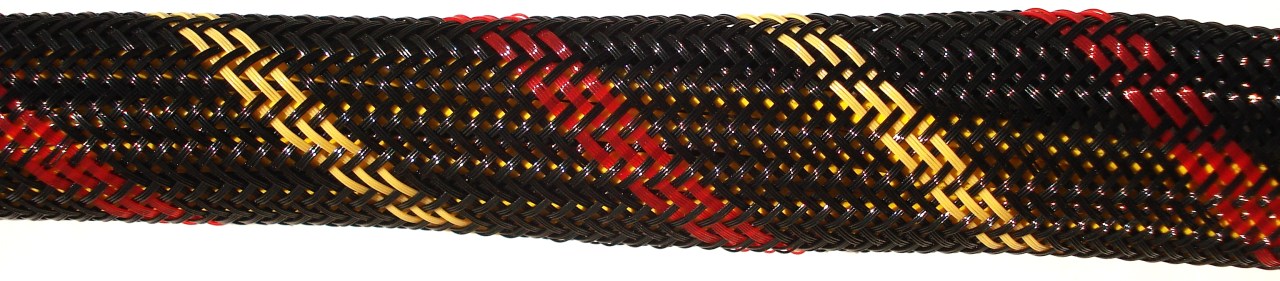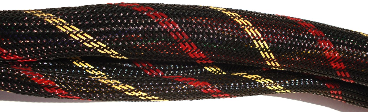 Las fibras del enmallado para proteger todo el cableado nativo y modular posee un acabado brillo en color negro con encintado en espiral rojo y dorado, diseño que nos puede recordar a los cordones y que es empleado por otros fabricantes, con otros aspectos y colores. Estas fibras son ignífugas, y cubren por completo todo el cableado interior, impidiendo que podamos verlo a simple vista. Este enfundado es bastante flexible, permitiendo doblar el cableado con relativa facilidad, pero a su vez garantiza que no lo doblemos en exceso.