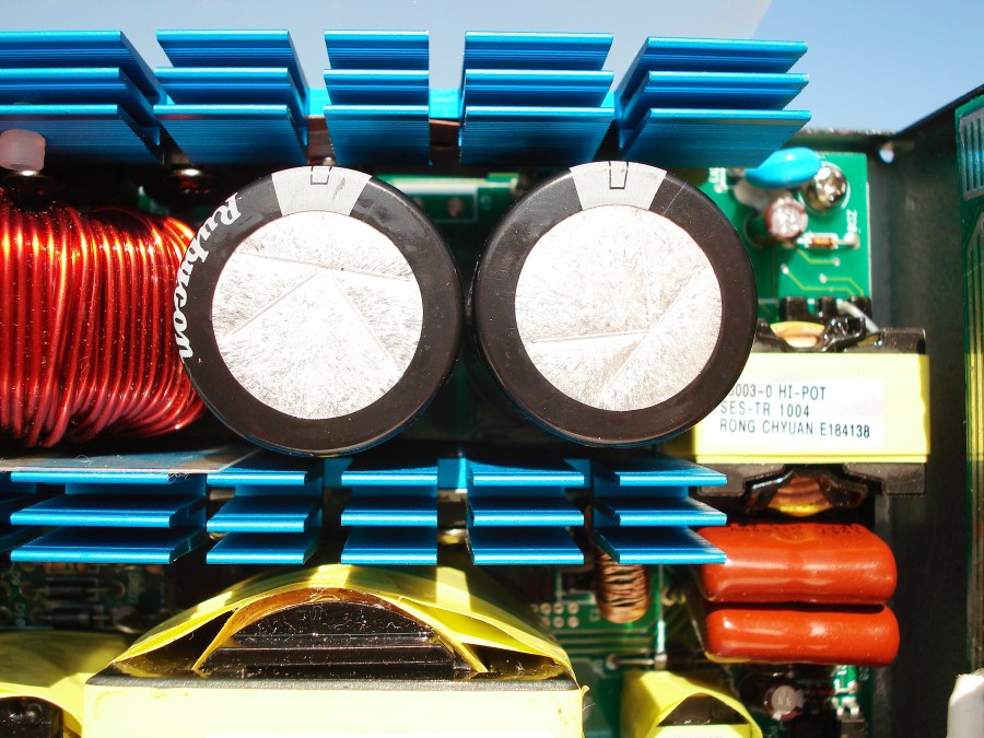 La fuente posee 2 grandes capacitadores principales de filtrado, con la capacidad de almacenar energía en su interior, como una pequeña batería pero a elevada tensión, de ahí su gran formato. Estos capacitadores de dos polos tienen el núcleo líquido y poseen gran capacidad. Podemos recibir una descarga eléctrica si están cargados al tocar sus 2 bornes a la vez. Están suficientemente separados de las placas de disipación de aluminio, aumentando así en seguridad.