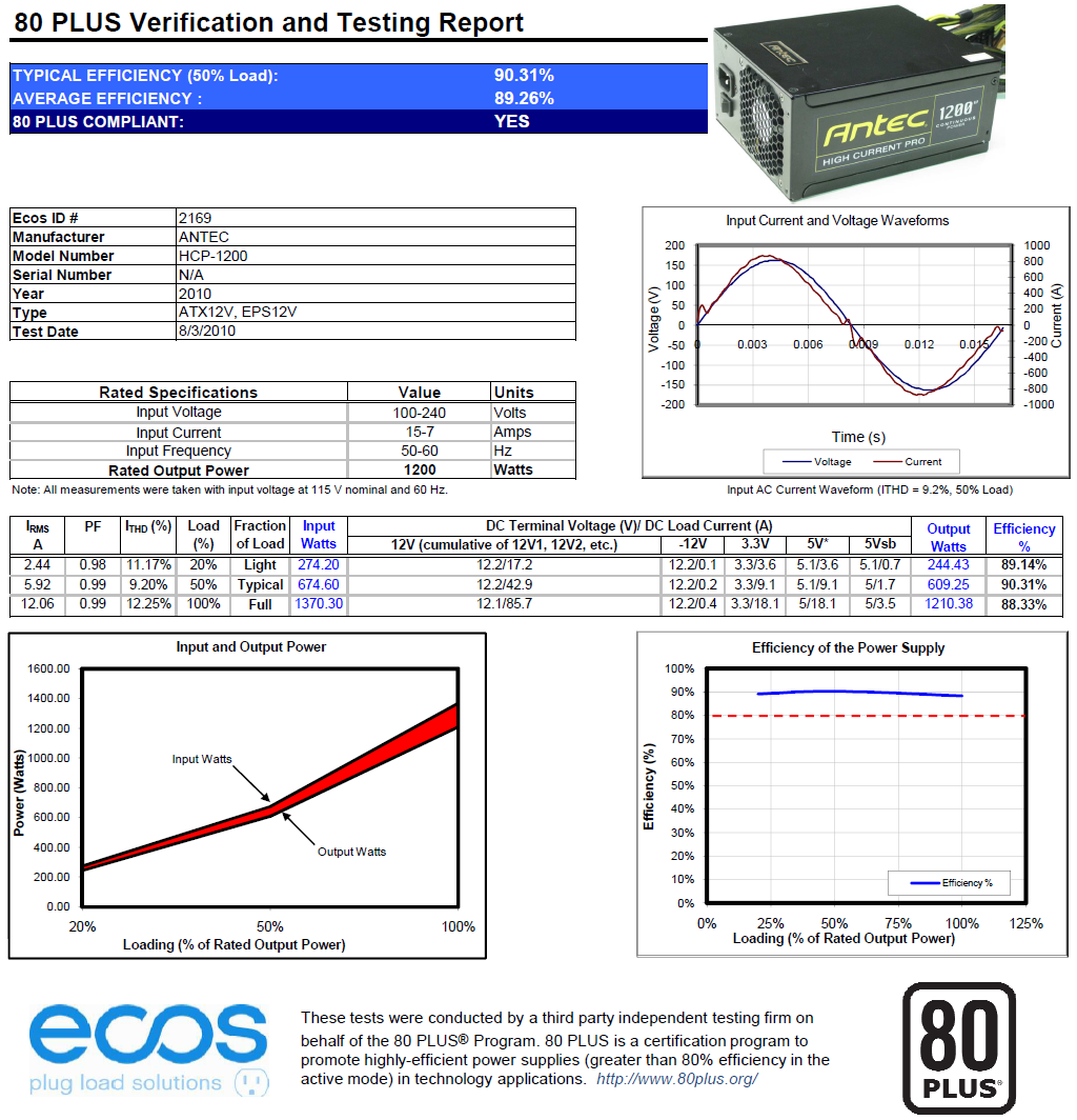 La fuente de alimentación Antec High Current Pro de 1200W (HCP-1200 revisión 00) ha sido ganadora del certificado 80 Plus Gold a finales del 2010.