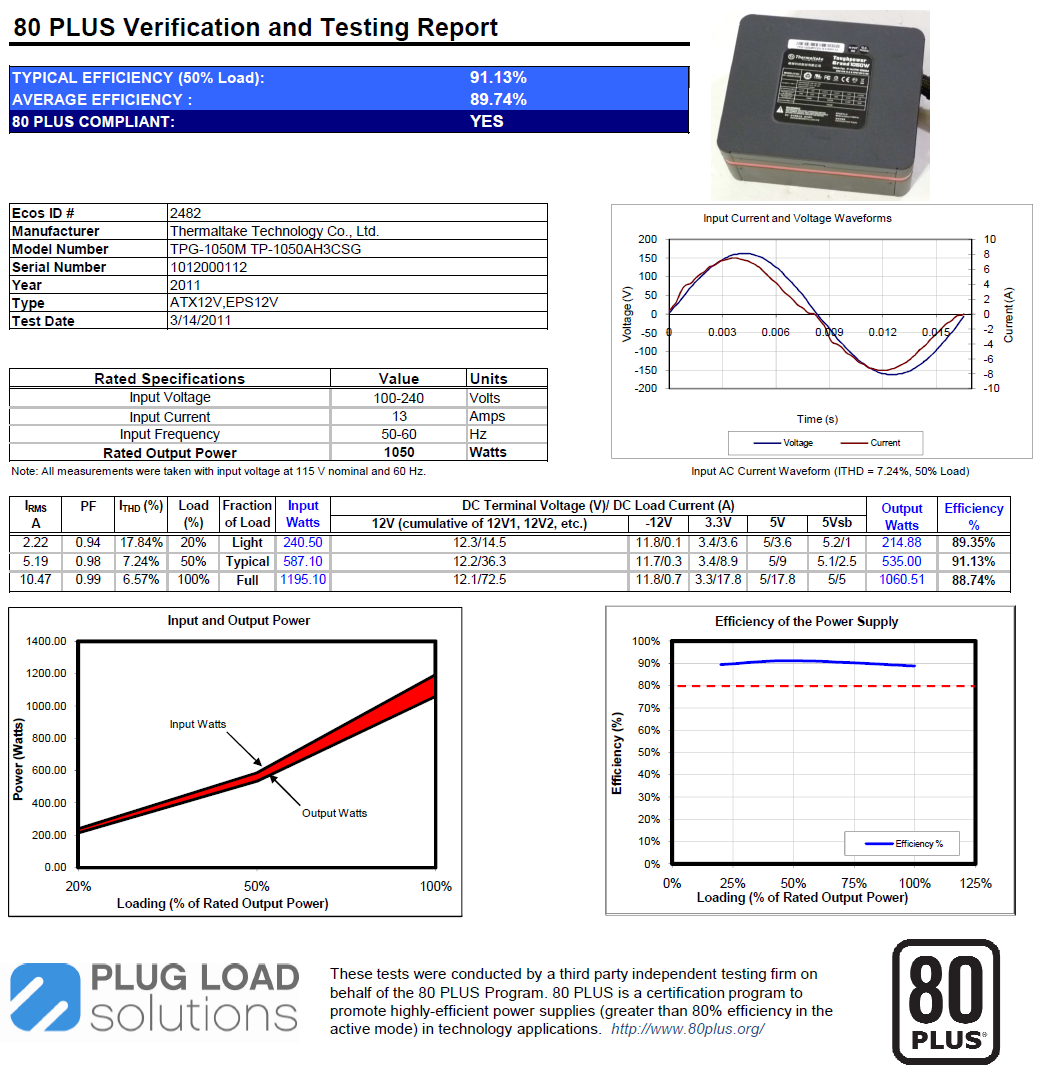 La fuente de alimentación Thermaltake Toughpower Grand de 1050W (TPG-1050 revisión A) ha sido ganadora del certificado 80 Plus Gold a principios del 2011.