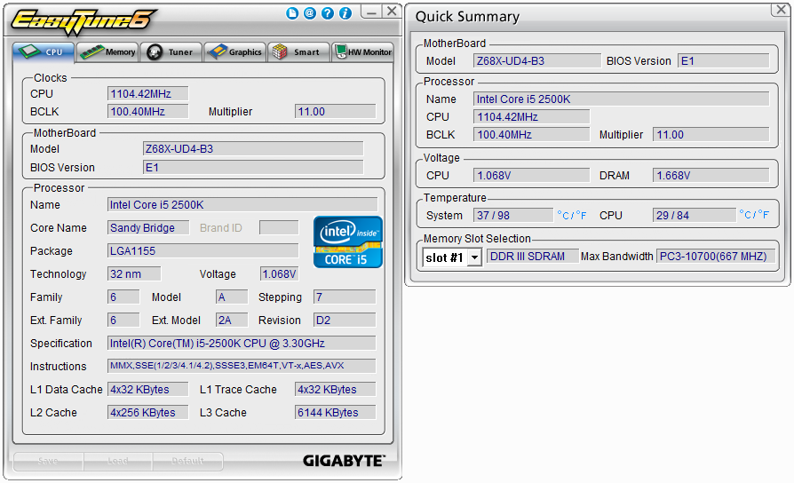 GIGABYTE GA-Z68X-UD4-B3. Utilidad Gigabyte EasyTune6. Sección CPU + Quick Summary