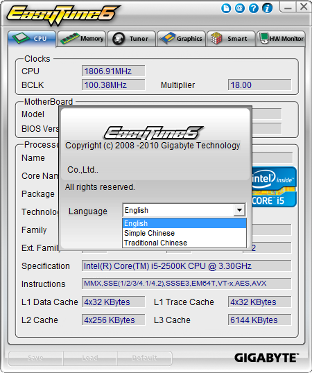 GIGABYTE GA-Z68X-UD4-B3. Utilidad Gigabyte EasyTune6. Sección Info con Cambio de Lenguaje