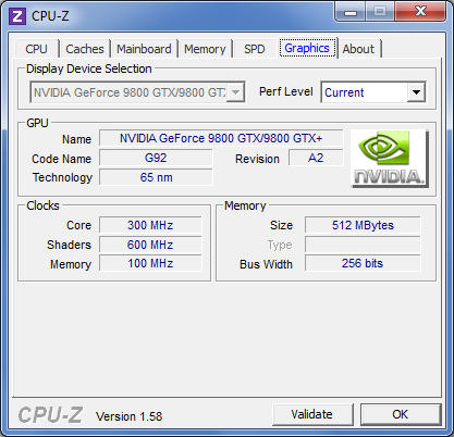 GIGABYTE GA-Z68X-UD4-B3. Programa CPU-Z. Sección Graphics. Zotac NVIDIA GeForce 9800GTX+ / Current