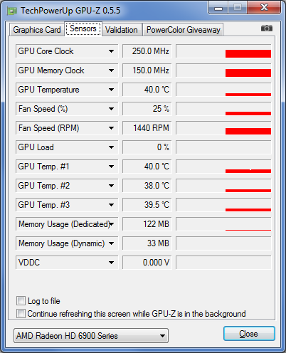 GIGABYTE GA-Z68X-UD4-B3. Programa GPU-Z. Sección Sensors. Sapphire AMD Radeon HD 6950 Dirt3