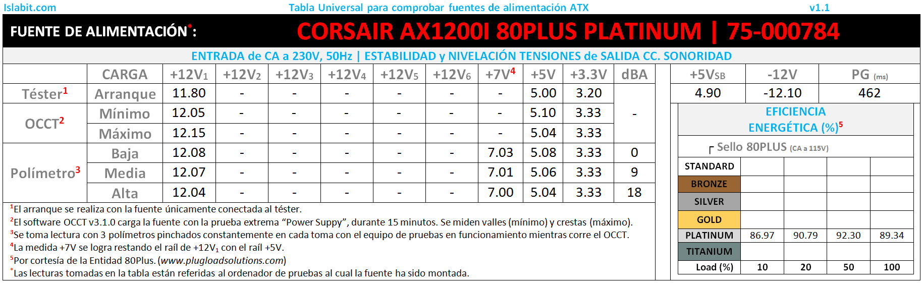 CORSAIR AX1200I. Tabla Estabilidad y Nivelación Tensiones Salida CC. Sonoridad. Eficiencia Energética