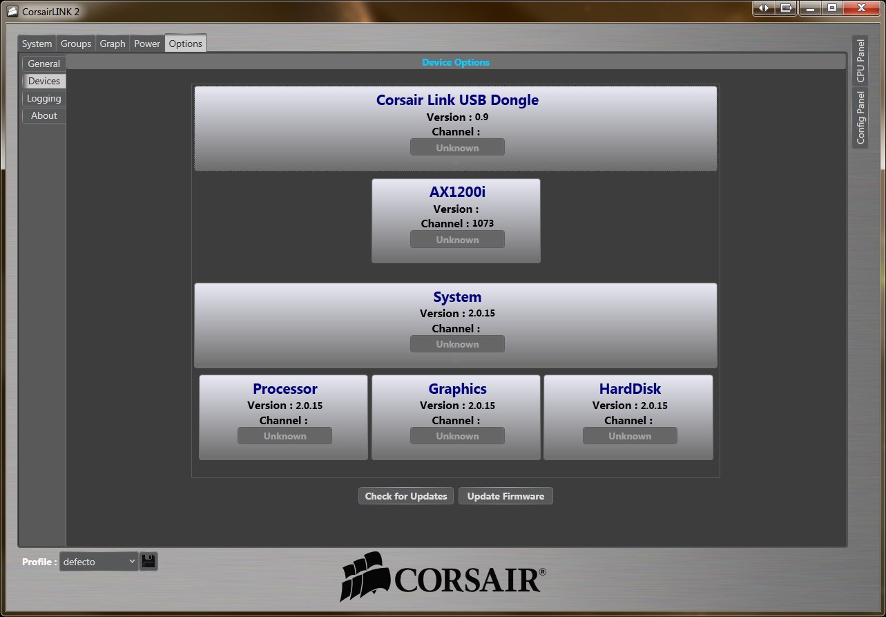 CORSAIR AX1200I. Captura Software Corsair Link 2 v2.0.15 Beta. Sección de «Options/Devices»
