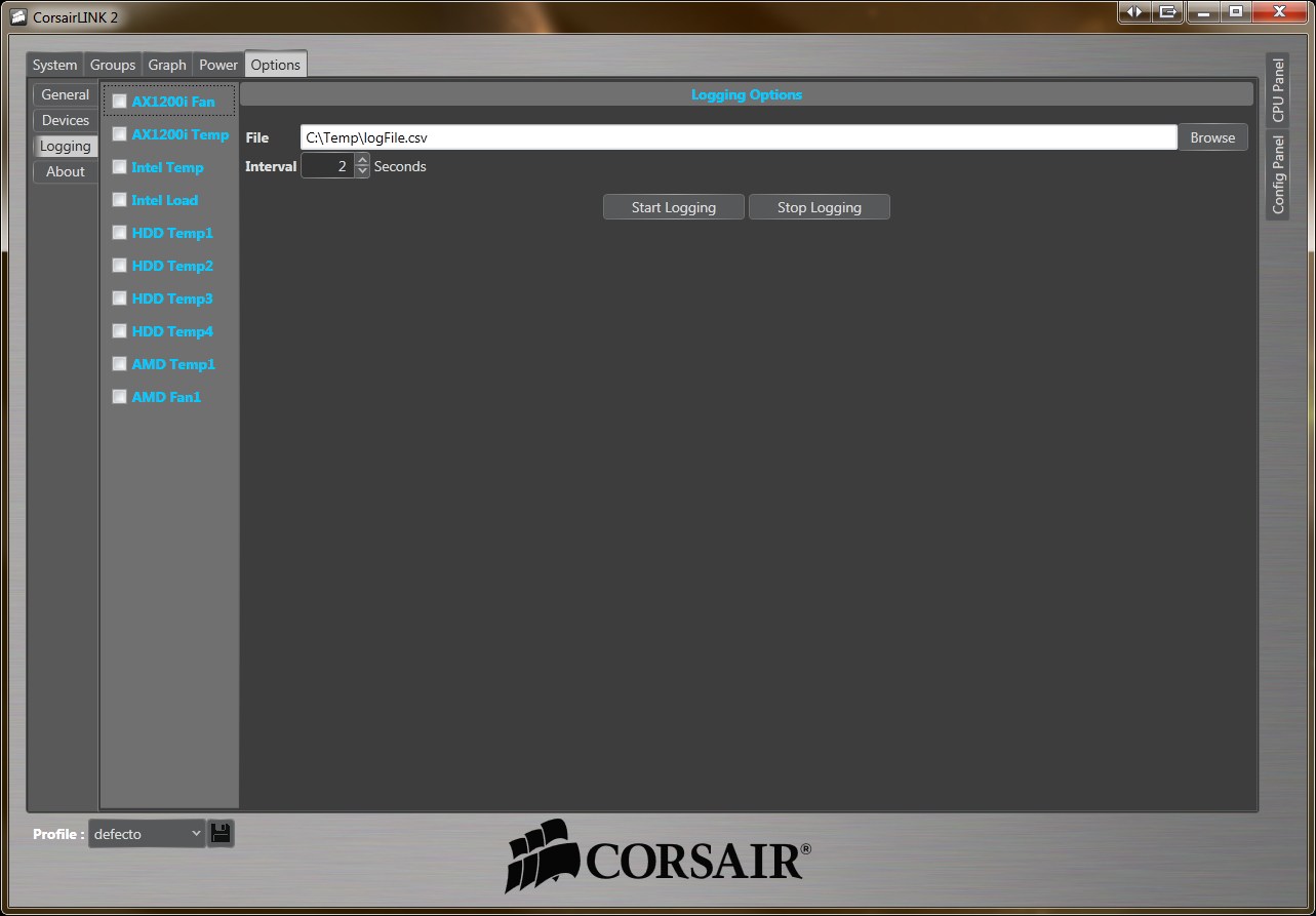 CORSAIR AX1200I. Captura Software Corsair Link 2 v2.0.15 Beta. Sección de «Options/Logging»