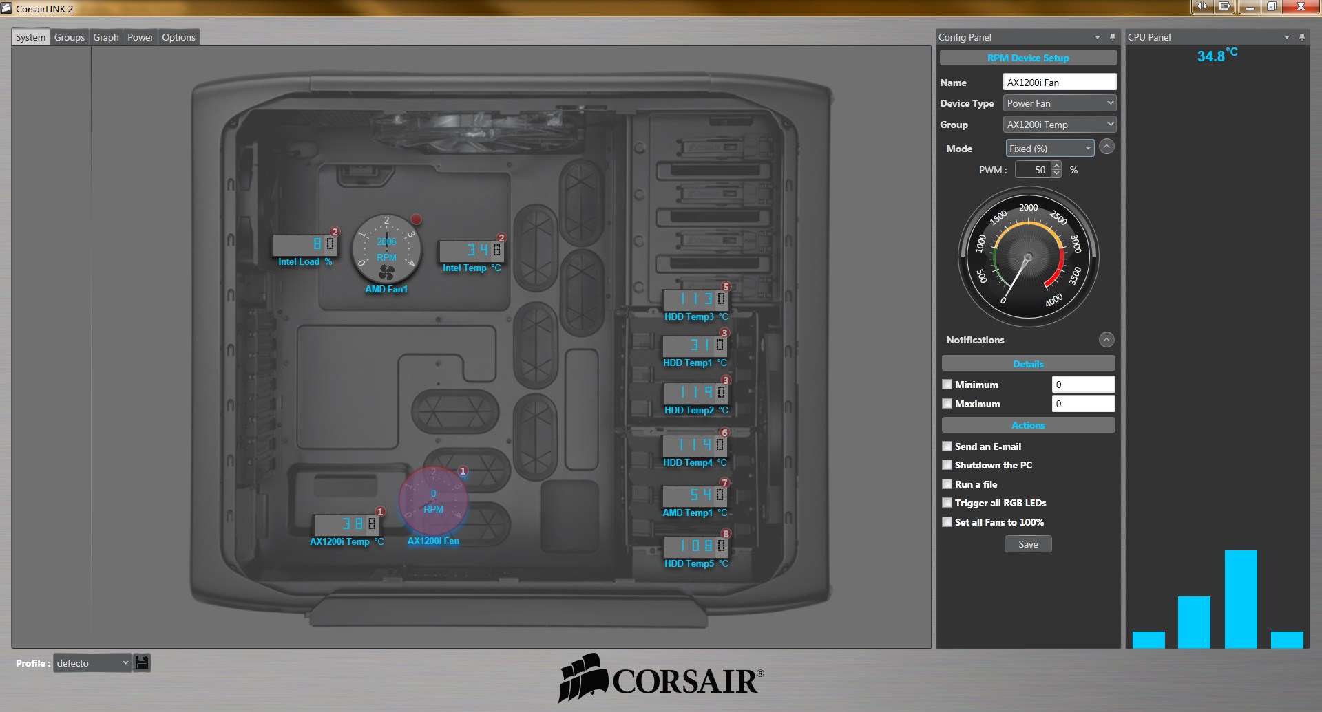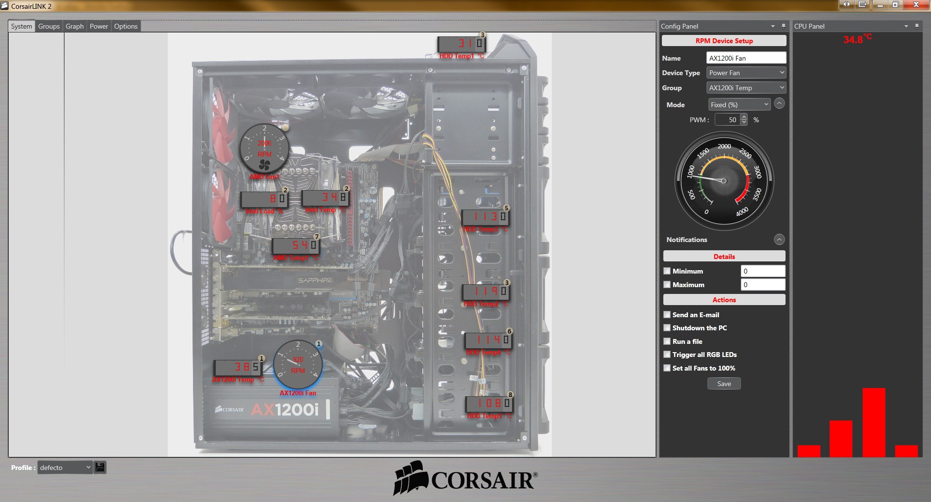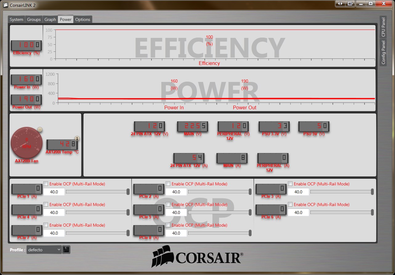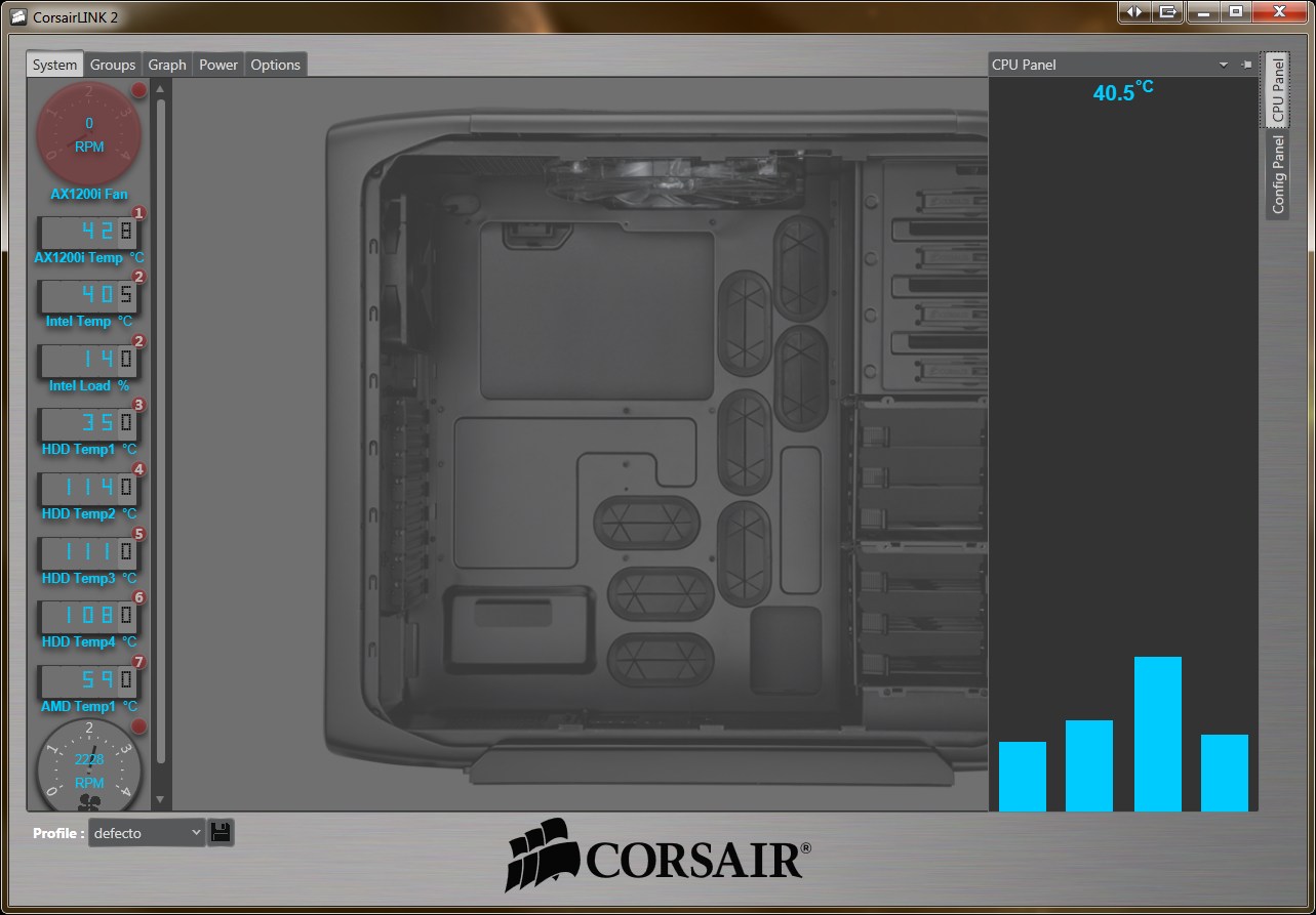CORSAIR AX1200I. Captura Software Corsair Link 2 v2.0.15 Beta. Sección de «System/Config Panel»