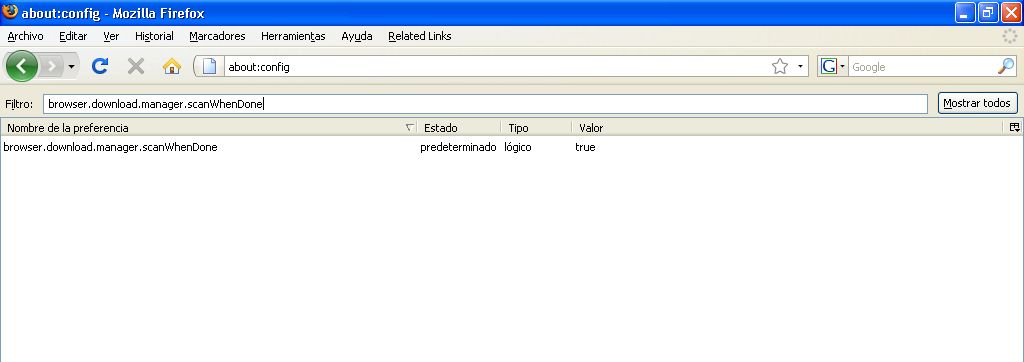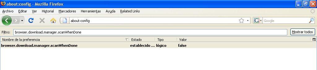 2) Esta zona no parece tan amigable para muchos, sino algo muy avanzado y complejo, pero bueno, sigamos, ahí, en el campo de Filtro: escribe browser.download.manager.scanWhenDone y en el área inferior aparece de forma automática el Nombre que hemos puesto.