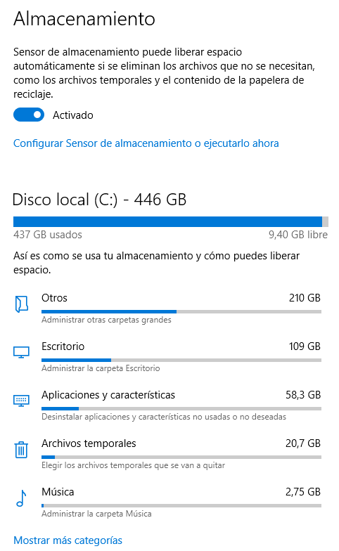Esta sección muestra un resumen del uso del dispositivo principal de almacenamiento de tu sistema, incluida la cantidad de espacio que utilizan las aplicaciones y funciones, así como sus archivos y carpetas que ocupan mucho, archivos temporales, etc.