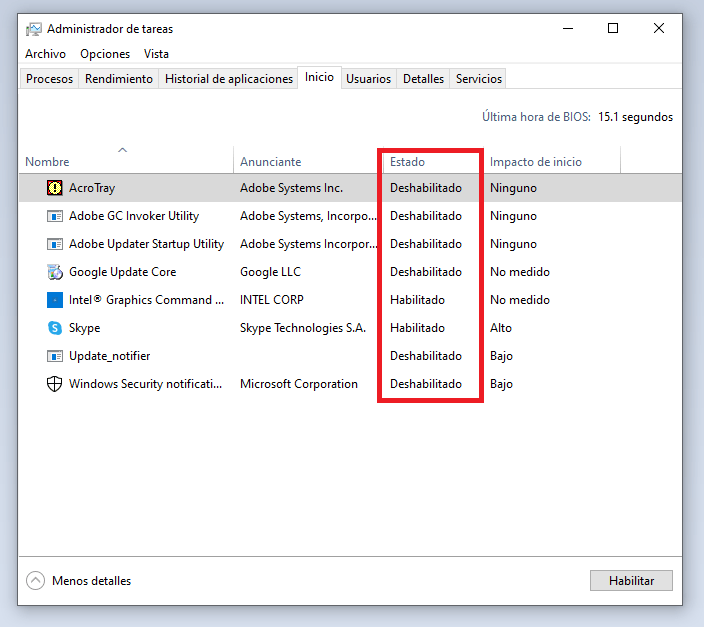 - Examina, de dicha lista, los que aparecen para que se inicien y, los que veas que no son necesarios o que tienen un gran impacto (se informa también en la lista), desactívalos para que no se inicien cada vez que se inicia Windows.