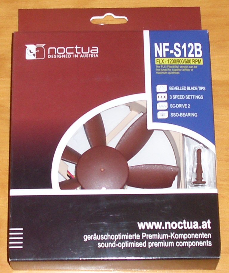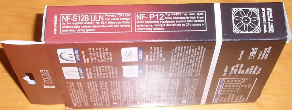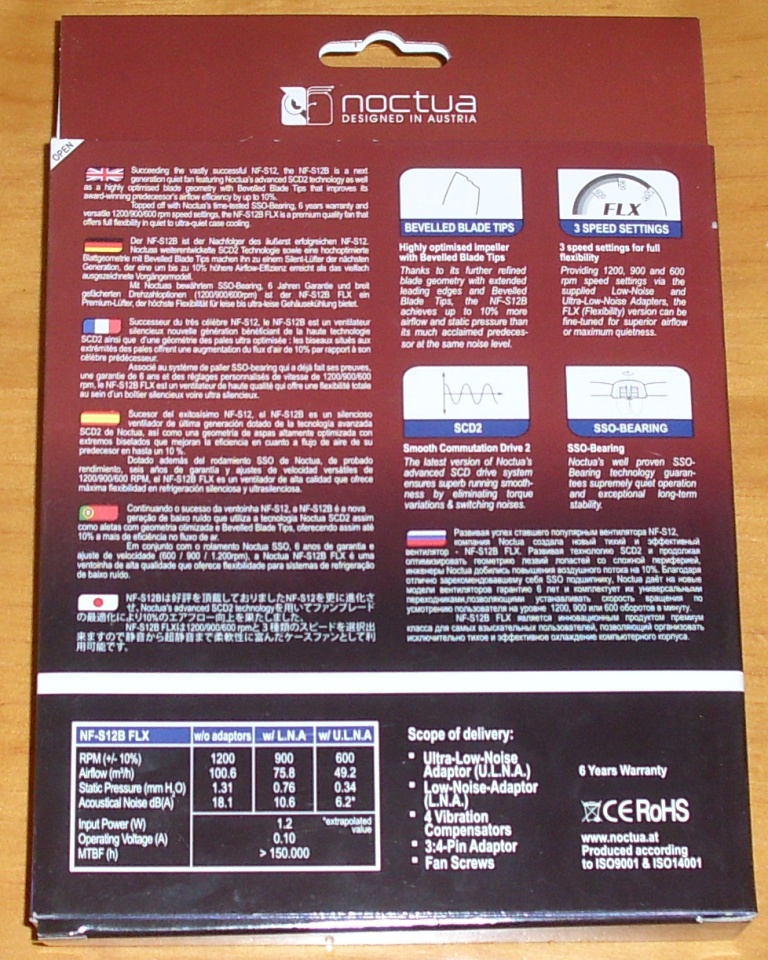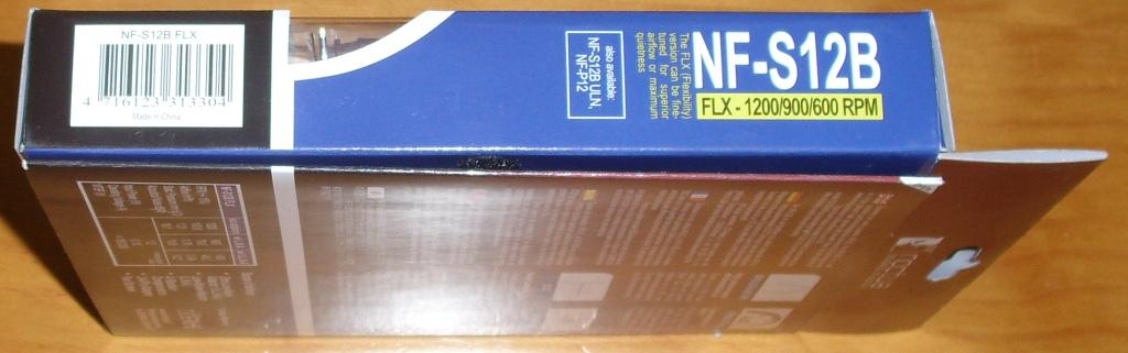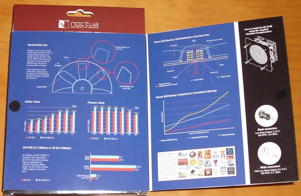 La parte trasera de la caja parece que sea un libro, aunque con una sola hoja. Cerrado el libro con un belcro, en la portada se explica en varios idiomas sus cuatro características principales: «Sucesor del exitosísimo NF-S12, el NF-S12B es un silencioso ventilador de última generación dotado de la tecnología más avanzada SCD2 de Noctua, así como una geometría de aspas altamente optimizada con extremos biselados que mejoran la eficiencia en cuanto al flujo de aire de su predecesor en hasta un 10%. Dotado, además, del rodamiento SSO de Noctua, de probado rendimiento, seis años de garantía y ajustes de velocidad versátiles de 1200/900/600 RPM, el NF-S12B FLX es un ventilador de alta calidad que ofrece máxima flexibilidad en refrigeración silenciosa y ultrasilenciosa».