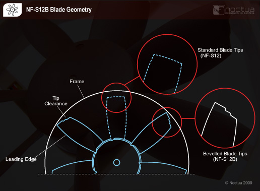 Reduciendo el espacio entre los extremos y el marco, incrementando la longitud de las aspas permite una mayor superficie de éstas, así como mejorar tanto el flujo de aire como la presión estática. Esta medida, sin embargo, tiende a sacrificar el nivel sonoro debido a la interacción crítica entre rotor y estator. Para el NF-S12B, este asunto se ha solucionado con sólo incrementar la longitud de las aspas en los bordes más salientes y añadiendo una estructura biselada (Bevelled-Blade Tips). Incrementando la distancia entre el rotor y el marco en los extremos más exteriores del ventilador donde se alcanzan mayores velocidades, los extremos de aspa biselados contribuyen a reducir la interacción crítica entre rotor y estator. En consecuencia, la modificación de la geometría de aspas original del NF-S12 en el NF-S12B combina los beneficios de la mejora de los extremos de las aspas con las de una mayor distancia entre el extremo del eje de salida y las partes del estator, logrando una mejora del 10% tanto en la tasa flujo de aire/ruido como en la tasa presión/ruido.