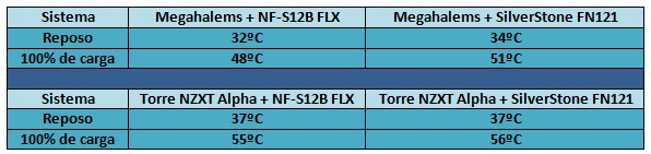Aclarar que el ventilador de Noctua lo hemos probado a 1200 RPM ya que el SilverStone NF121 funciona a esa velocidad, además, cuando se han realizado las pruebas de los ventiladores en la torre NZXT, el refrigerador Megahalems no tenía ningún ventilador instalado, únicamente estaba el disipador, por eso la temperatura aumentaba algunos grados considerables. Teniendo en cuenta estos detalles, vemos como la temperatura en reposo y la de carga al 100% con el refrigerador Megahalems es un par de grados menos que con el FN121, mientras que cuando estaban instalados en la carcasa NZXT sólo había 1ºC de diferencia a 100% de carga, por lo que la diferencia es mínima, eso sí, el nivel de ruido generado en ambos ventiladores si que era muy notable, el Noctua NF-S12B FLX era infinitamente más silencioso que el SilverStone.