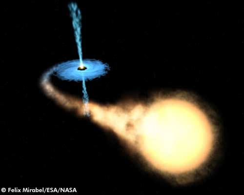 – Perdona, ellos directamente no – digo levantando las manos- . Lo que ocurre es que en muchos casos los agujeros negros están «casados» gravitatoriamente con estrellas bastante desgraciadas, formando un sistema binario muy especial en el que el campo de marea del agujero negro arranca materia de su estrella compañera, atrayéndola progresivamente hasta formar un disco giratorio alrededor de él. Hasta ahí, nada nos permitiría ver el agujero – asiente de nuevo- . Pero según el gas va cayendo y rotando, su fricción en el disco es tan intensa y la velocidad que alcanza, acelerada por el campo gravitatorio, tan grande, que en el proceso no se libera luz visible sino rayos X, muchísimo más energéticos. Y éstos, emitidos desde fuera del agujero negro, sí que pueden alejarse y llegar hasta nosotros.