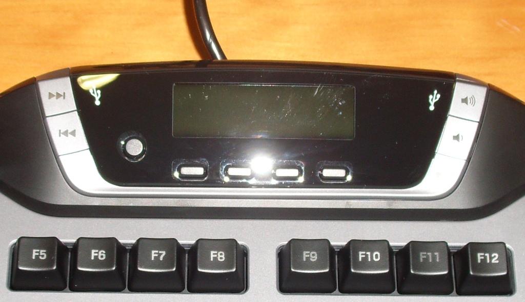 La pantalla LCD, como ya se ha mencionado antes, también ha sido retocada respecto al diseño anterior. Anteriormente tenía que ser levantada para poderse ver y era propensa a romperse con un pequeño golpe, pero ahora viene integrada en el teclado, es más grande y muestra información del sistema cuando no estás jugando (hora, uso de la RAM, uso de la CPU, etc), e información útil del juego cuando estás jugando (estadísticas del juego, datos del servidor, etc). Esa información puedes ir variándola por medio de los botones negros que se encuentran justo debajo de la pantalla, mientras que los botones que la rodea, de color gris, con botones de acceso rápido multimedia: reproducción, pausa, detener, atrás, adelante y subir o bajar volumen.