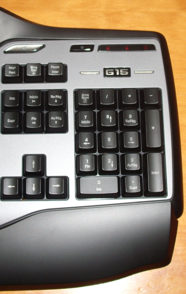 Justo encima del teclado número, aparece iluminado el modelo del teclado, G15, y un poco más arriba se informa de color rojo si están activadas las mayúsculas, así como el teclado número. Al lado tenemos el botón de iluminación que anteriormente hemos comentado, para enchufar/desconectar la retroiluminación, así como ponerle más intensidad. A continuación, un poco más separado, el botón para activar/desactivar el sonido.