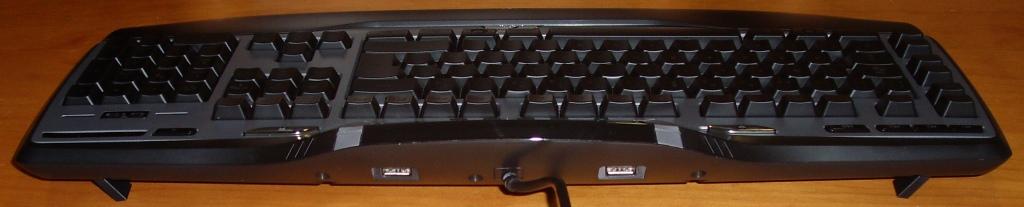 Las últimas cosas que quedan comentar de esta mirada al teclado, es el reposa-muñecas, que puede ser quitado si tienes poco espacio, aunque con él su comodidad es mayor; detrás de la pantalla LCD existen dos puertos USB, en el que puedes conectar cualquier dispositivo con el mismo interfaz de conexión; y, en la parte trasera, unos raíles para poner el cableado y así tenerlo más organizado.