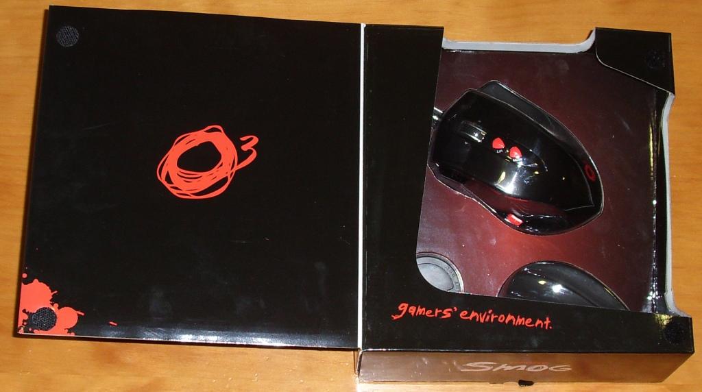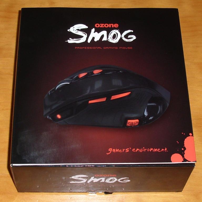 La caja del ratón Smog de Ozone guarda un parecido a la del Oxid, una caja cuadrada de cartón bien trabajada, voluminosa, con color predominante negro y rojo, ambos distintivos del fabricante, al igual que del mundo Gaming, y con forma de libro con una hoja de dos páginas, cerradas por dos trozos de belcro. En la portada, aparte del nombre de la compañía y del modelo del dispositivo, se aprecia perfectamente el ratón que guarda en su interior gracias a la fotografía situada en el centro. En ella se pueden ver los diferentes botones que trae de color rojo, y parte del diseño ergonómico con un acabado inferior en punta.
