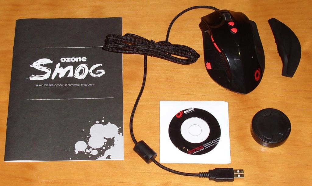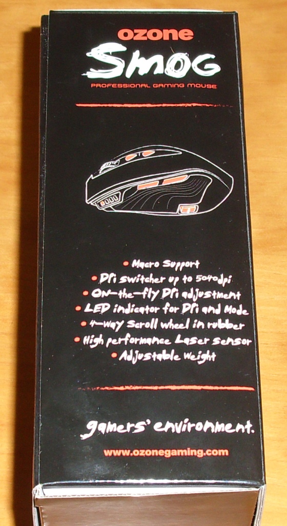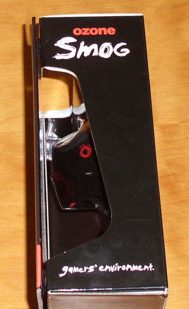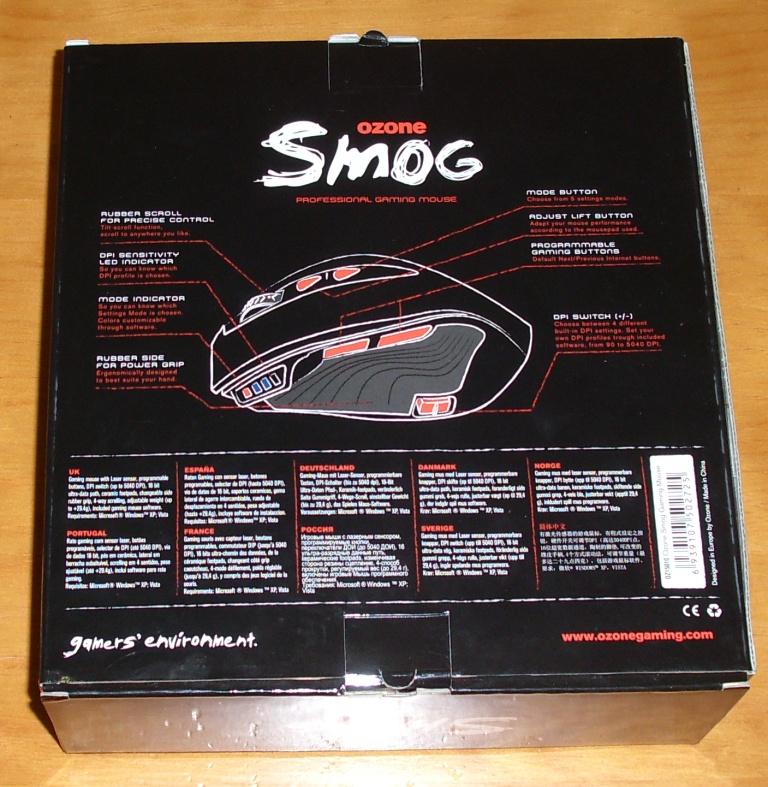 A continuación, se informa al usuario en varios idiomas, entre ellos el español, que se trata de un «Ratón Gaming con sensor láser, botones programables, selector de DPI (hasta 5040 DPI), vía de datos de 16 bit, soportes cerámicos, goma lateral de agarre intercambiable, rueda de desplazamiento en cuatro sentidos, peso ajustable (hasta +29.4gr), incluye software de instalación. Requisitos: Microsoft Windows XP; Vista». Aunque no nombre a Windows 7, las pruebas que se han realizado en este review han sido bajo el sistema operativo Windows 7 RTM y es prácticamente compatible con todas las funciones y características que el ratón Smog ofrece, el único problema es que no se pueden guardar los perfiles, pero seguro que cuando aparezca Windows 7 oficialmente, Ozone lanzará una versión actualizada del software compatible al 100% para el nuevo S.O. de Microsoft.