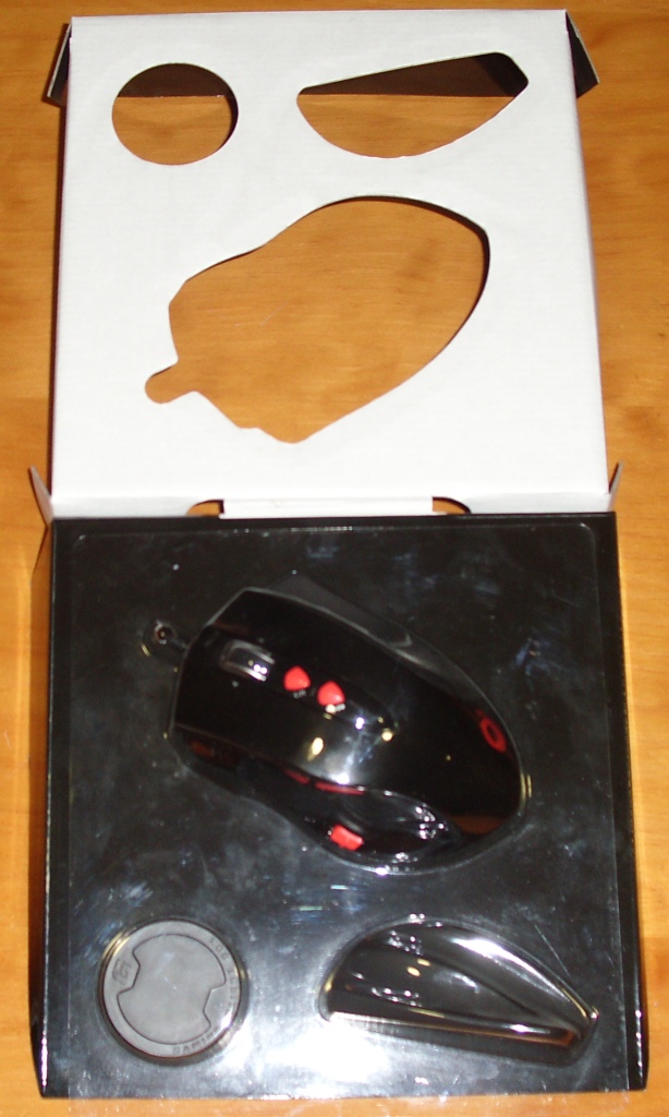 Al abrir el «libro», ya se puede ver el ratón en todo su esplendor, el cual está cubierto por una funda protectora de plástico, al igual que la pieza derecha del ratón de recambio y de diferente diseño, y el cubo que alberga los seis pesos de 5 gramos cada uno. en la otra hoja, toda de color negro, sólo se ve el logo de la compañía Ozone, y su mancha de sangre en la esquina.