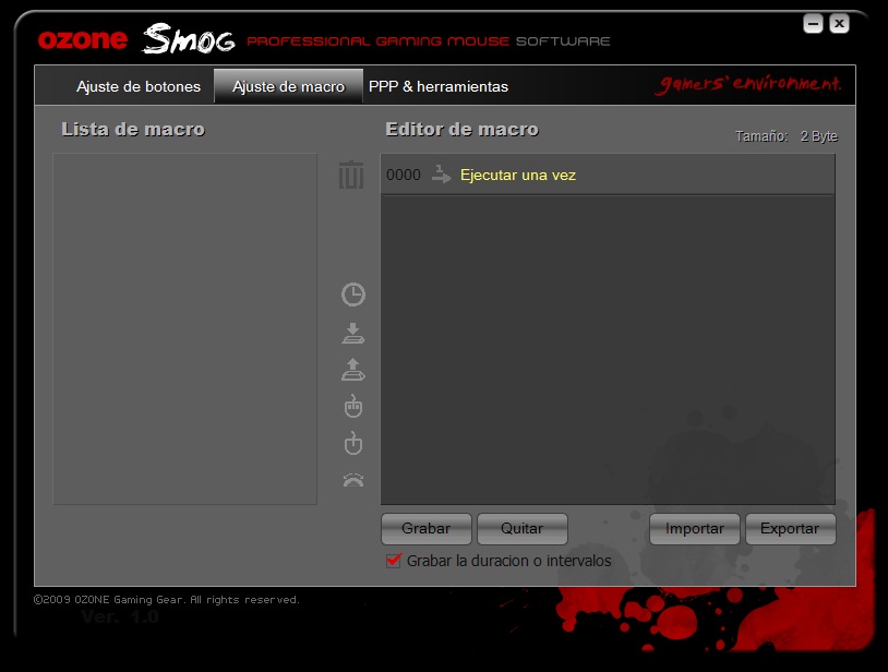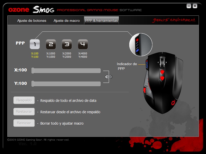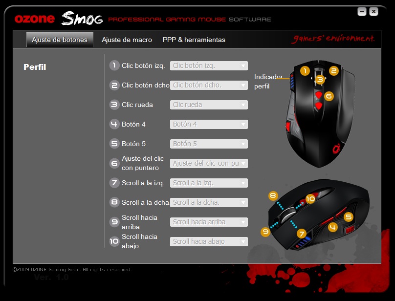 El ratón Ozone Smog no requiere instalación, ya que es Plug & Play, pero trae un pequeño software para configurar los 10 botones, incluyendo los cuatro de la rueda de desplazamiento, que trae el ratón, al igual que la sensibilidad, y configurar los perfiles que se quedarán almacenados en el sistema. Lástima que no incorpore una memoria interna para poderse utilizar los perfiles en cualquier otro sistema.