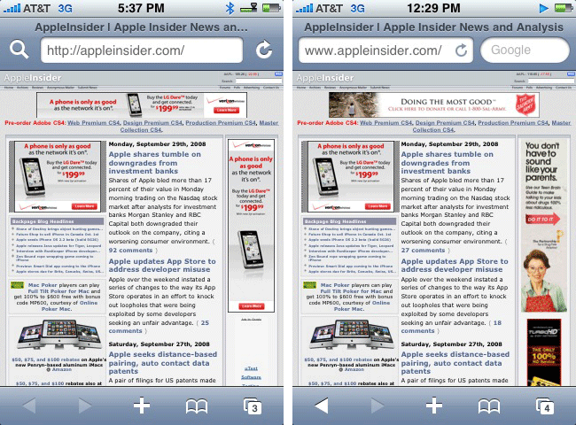 Safari: iPhone Atlas informó de haber cambios en la interfaz de usuario en Safari, como el traslado del botón refrescar en la barra de direcciones para ahorrar espacio, o la sustitución de la lupa de Google Search por la barra de Google Search al lado de la barra de direcciones. Además, nuevas mejoras en el motor JavaScript que permiten más rapidez de las aplicaciones web.