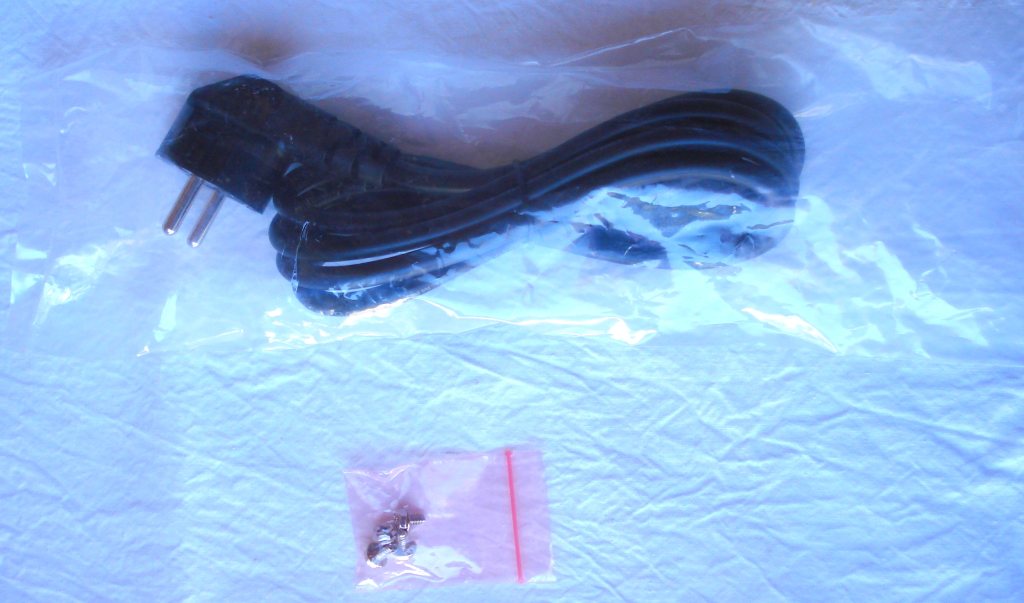 El cable de alimentación está envuelto con una bolsa de plástico estanca sin cierre. Se necesita romper o cortar para sacar el cable. La pequeña bolsa de los 4 tornillos es de cierre.