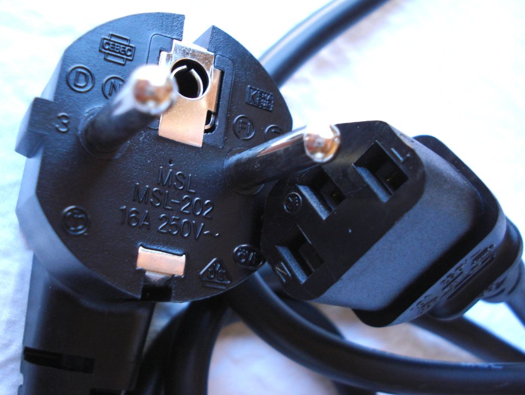 Detalle de los conectares macho y hembra del cable de alimentación. Se nota la calidad del mismo, y soporta 250V y 16A, más que suficiente para soportar la tensión de nuestro hogar. Dispone de sus dos fases y por supuesto de la toma de tierra TT.