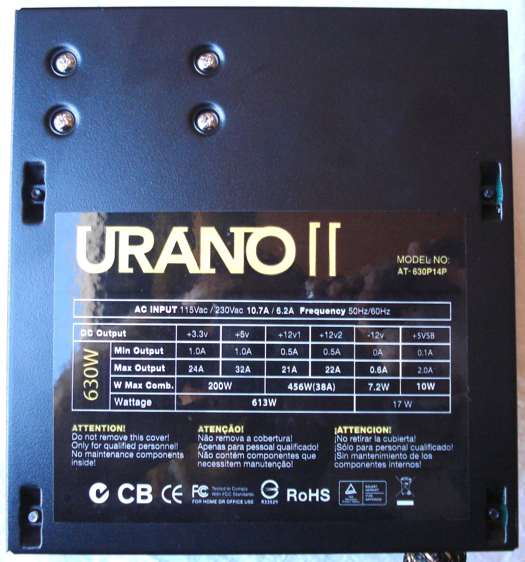 Cara superior de la NOX Urano II 630W. En ella está «colgado» por el interior la placa electrónica de circutería de la fuente, que se adivina por esos 8 tornillos. Luce una pegatina con el nombre y modelo y con sus características técnicas ya nombradas. A su vez, nos muestra una advertencia en los tres idiomas principales, indicando la prohibición de abrir la fuente. En la fila inferior se ven los controles y cumplimientos que según el fabricante, ha superado.