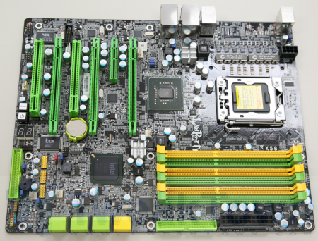 Lamentablemente no estaba el refrigerador heatpipes, por lo que no pudieron hacerle fotos. DFI ha decidido hacer ellos mismos el refrigerador para mejorarlo y reducir costes. Aparte de esto, la placa soporta triple canal de memoria DDR3, incorpora ocho puertos SATA para unidades internas, soportará también CrossfireX y SLI mediante sus tres PCI-E 2.0. Por último, tiene dos botones internos, uno de reset y otro de encendido/apagado.