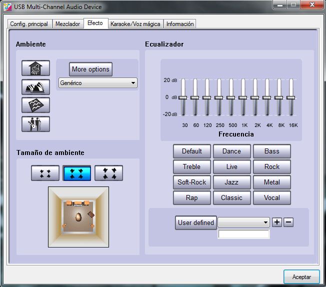 Ecualizador y efectos de ambiente (cuarto grande, mediano y pequeño).