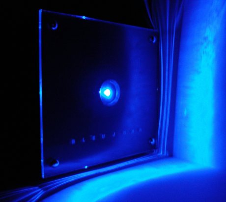 Mini Caja AS encendida con efecto Modding a oscuras. Vista de Esquina. LED azul en acción