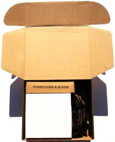 Lo típico: una bolsa de cierre con 4 tornillos y el cable de alimentación CA para la fuente en otra bolsa de plástico sin cierre. Lo extríctamente necesario.