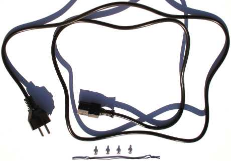 Longitud del cable: 1.8m. Los 4 tornillos son de cabeza dentada, y un filamento metálico forrado en negro para recoger el cable.