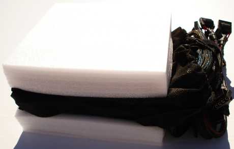 Aquí tenemos el componente que más nos importa. Por tanto, damos suma importancia a sus buenas protecciones contra impacto por el transporte. Como veis viene a «modo de sandwich» con dos protecciones tanto arriba como abado de la fuente. Vamos a desenfundar la fuente a ver de qué nos desprendemos.