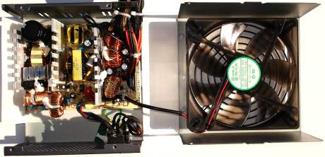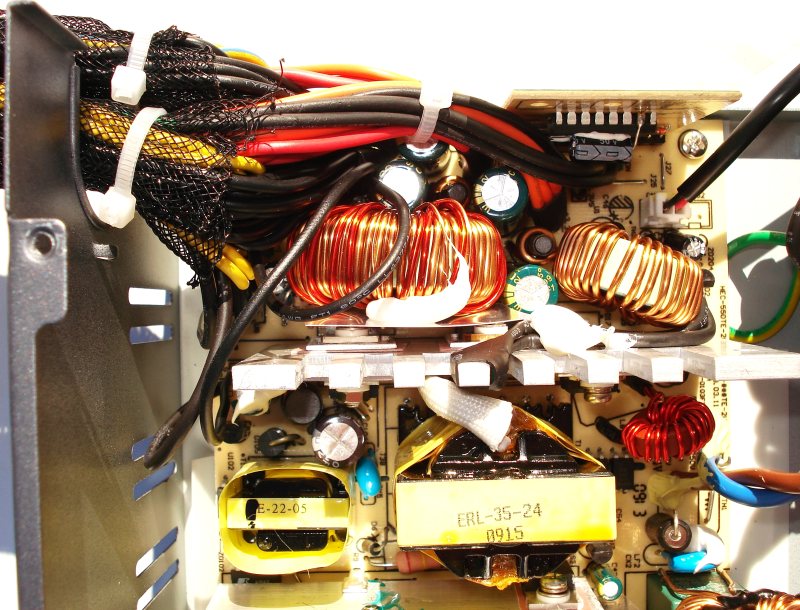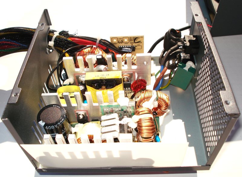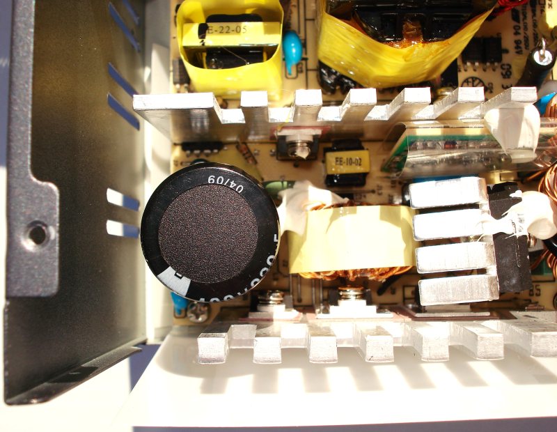 Viendo el interior de la fuente, con solo dos cosas que hiciera el fabricante, ganaría muchos enteros con su aspecto. Una sería pintar completamente su interior. Y la otra es cambiar el color de la placa electrónica, por otro más oscuro. Este color amarillo claro le da un aspecto de poca calidad, cuando no lo es para nada. De todas formas una fuente no está hecha para ser abierta, de hecho nos lo prohíbe el fabricante. Así que deducimos que aparenta realmente lo que no es, ya que recordemos que tiene una eficiencia del 85% (uno de los motivos principales de nuestra review) y lo consigue con una circutería de este aspecto. Otras fuentes más vistosas por dentro, no tienen para nada esta virtud. Así que no os dejéis engañar jamás por el aspecto de las fuentes de alimentación en general (y mucho menos por dentro), porque os podéis llevar una sorpresa.