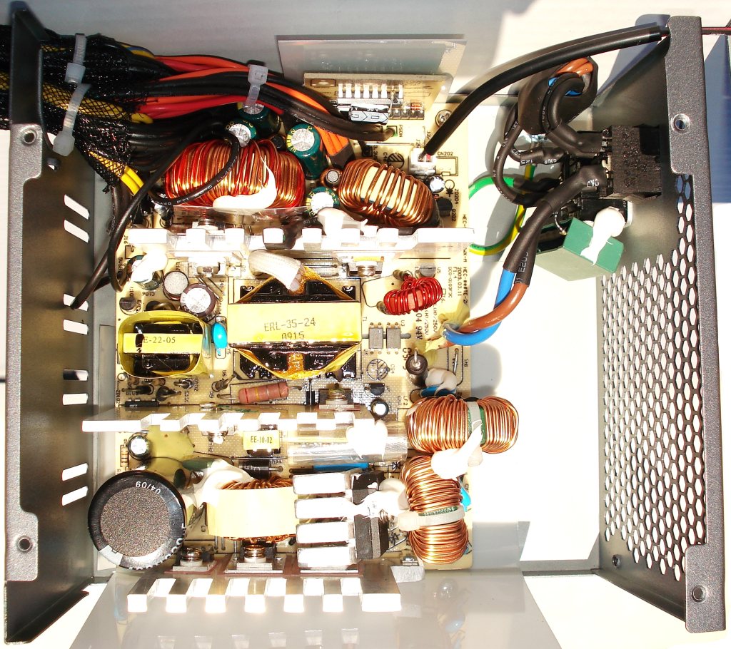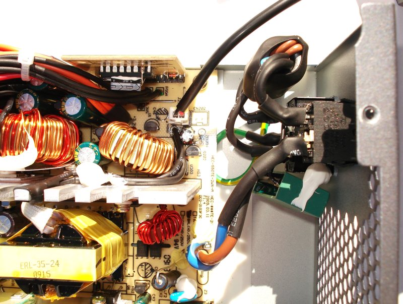 Esta es la «zona de salida», con las tensiones ya transformadas. PFC en la parte superior derecha y cableado enfundado en la superior izquierda. Viene con 2 bridas para no tirar de ella hacia fuera. Si os fijáis, el chapado de metal está doblado hacia dentro para evitar cortes, tal como apuntamos anteriormente.