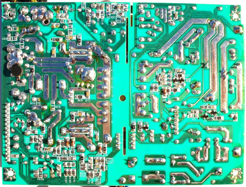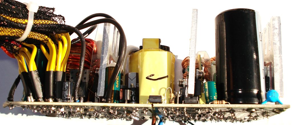 Hasta aquí llegamos. La placa electrónica de la fuente tiene este aspecto por su cara inferior. Se desarma quitando solo 4 tornillos, y resulta bastante difícil de desmontar. Las soldaduras son de calidad, y eso se nota. Si la ampliáis veréis que es todo estaño y no hay rebose ni decapado, ni tampoco soldaduras excesivamente gruesas. Viendo esta cara se puede sacar mucha información de la fuente.