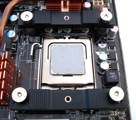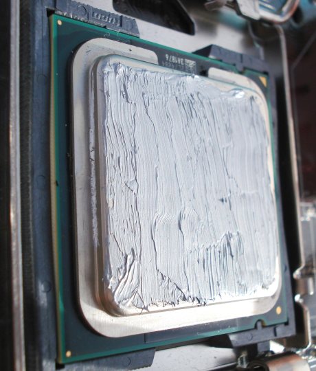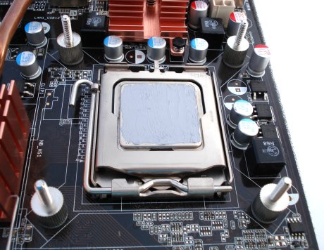 Con una mini espátula de plástico, o un carnet D.N.I. o, en nuestro caso, un palillo redondo de madera para los dientes, hemos repartido uniformemente la pasta por toda la superficie, intentando no cargar los bordes, ya que al soportar la presión que ejercerá la base del disipador sobre ella, ésta rebosará. La cantidad idónea es una muy fina capa, como un folio de 80 gramos de grosor. Cuanta menos pasta metamos mejor, siempre y cuando esté bien cubierta la superficie del procesador. Ya sabéis que la pasta hace de superconductor del calor, aumentando la superficie de contacto procesador-base del disipador. Esta pasta ha resultado ser muy cómoda de aplicar por su escasa viscosidad. Es bastante fluida. ¡Hay cada componente térmico por ahí que tela para ser aplicado! Veamos cómo montar ya el disipador.