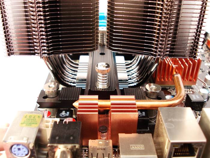 El conjunto trabaja presionando los 2 soportes paralelos hacia arriba, y el soporte transversal queda presionado hacia abajo. De manera que las 4 roscas superiores en las 4 puntas son las que sufren toda la presión que contrarresta el momento de vuelco del disipador. Un diseño sumamente sencillo y efectivo.