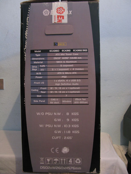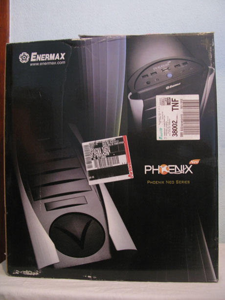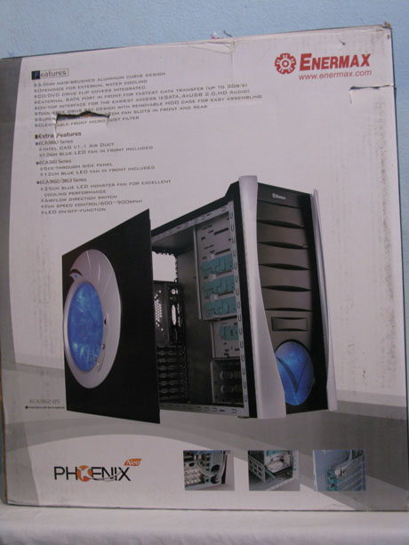 La parte trasera ya es mas técnica, en ella encontramos una foto de gran tamaño en la que se observa la carcasa Phoenix Neo, en la parte superior sus especificaciones técnicas, extras, la dirección de la web… Y en la parte inferior podemos observar también unas pequeñas imágenes donde muestran algunas de las mejores características de la torre como por ejemplo los agujeros que vienen de serie para la instalación de la refrigeración liquida y los raíles para los discos duros y unidades ópticas, que utilizan un sistema de fijación sin la necesidad de utilizar el destornillador.