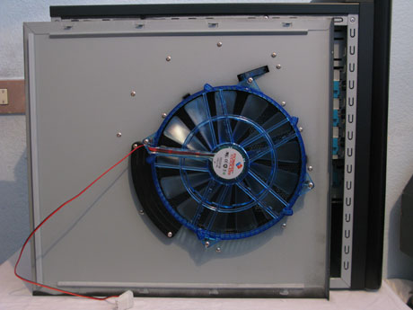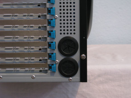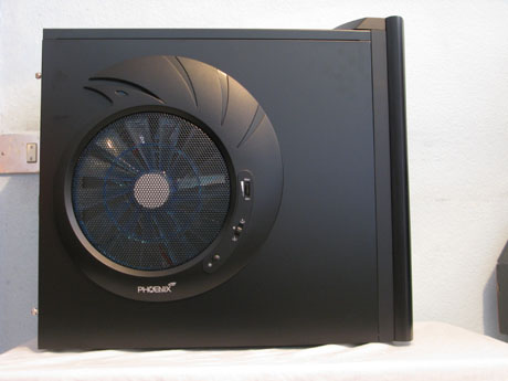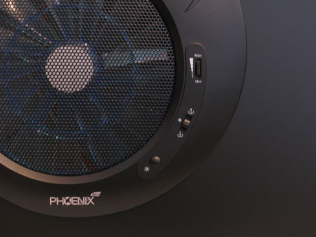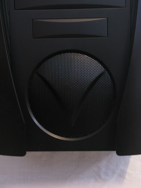 Ahora vamos a lo que seguramente es lo más vistoso de esta caja, su enorme ventilador lateral de 25 x 25 cm. Este ventilador, aparte de un diseño muy elegante trae algunos «extras» que son muy agradables; para empezar el ventilador tiene un regulador externo de velocidad con el cual podemos aumentar o disminuir la velocidad de este, ya sea para enfriar el ordenador o para producir menos ruido. Aparte trae un botón con el cual podemos encender o apagar los led’s del ventilador, característica que será de agradecer para los que tienen el ordenador en su habitación y desean dormir con un silencio absoluto.