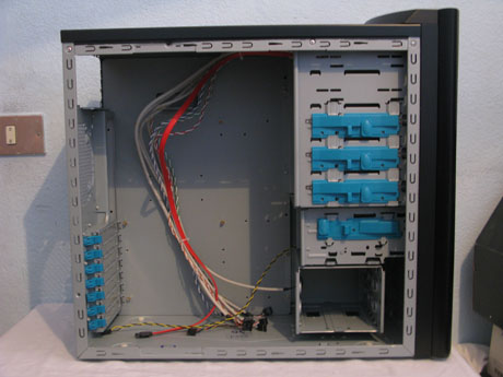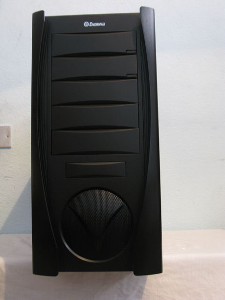 Para finalizar el frontal trae bahías externas para las unidades ópticas de 5.25″ y una de 3.5″ para multilectores de tarjetas flash, o incluso para discos duros. Justo debajo, como en la mayoría de las cajas, una ranura para meter un ventilador estándar de 12 x 12.